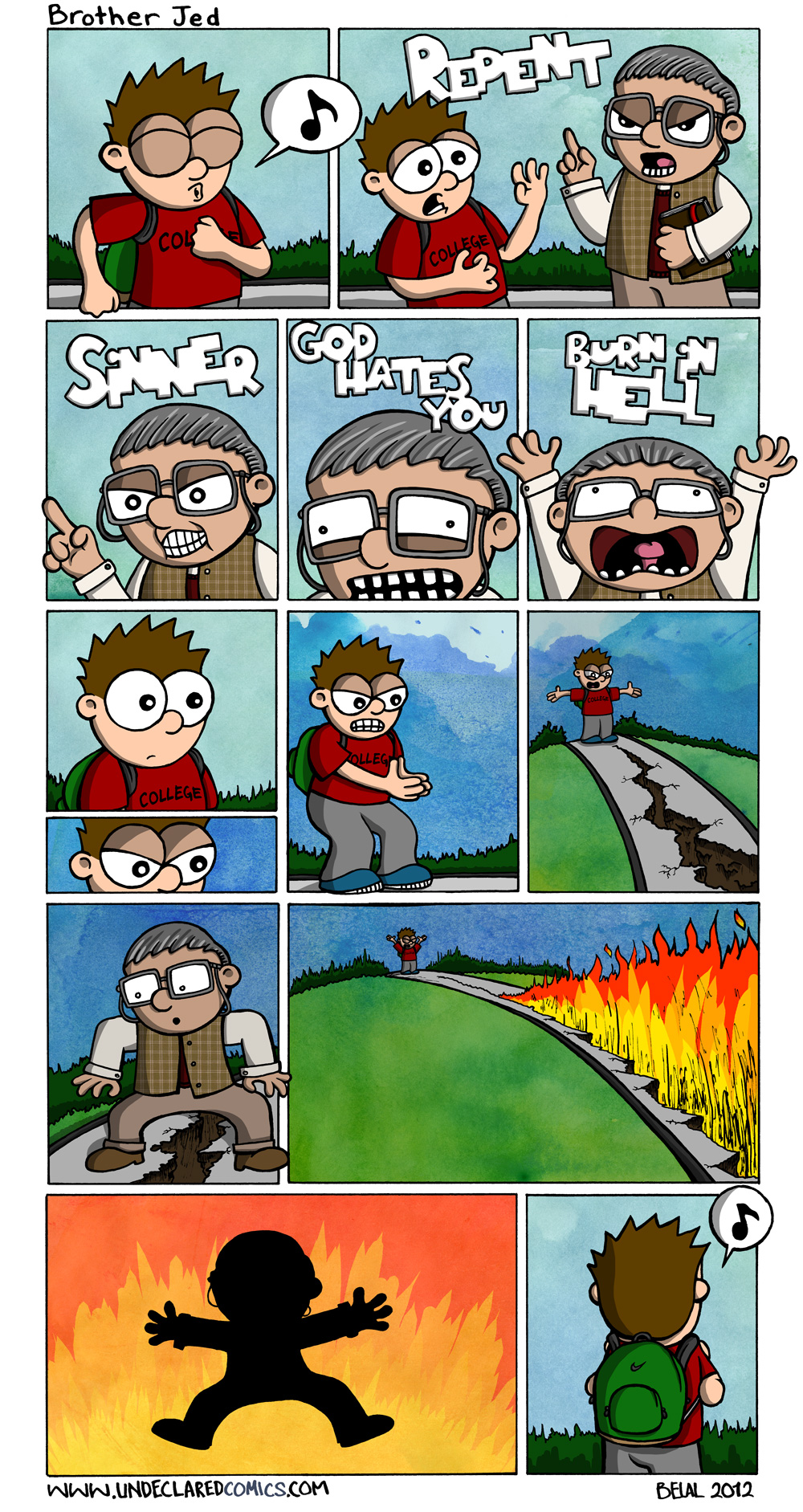 I agree with Chris and Chris. I'm a Christian too, and while I agree that people like "Brother Jed" create a bad stereotype for us, commenting on their crazy antics just makes for good humor. Great strip, Belal. Some people are a little oversensitive.