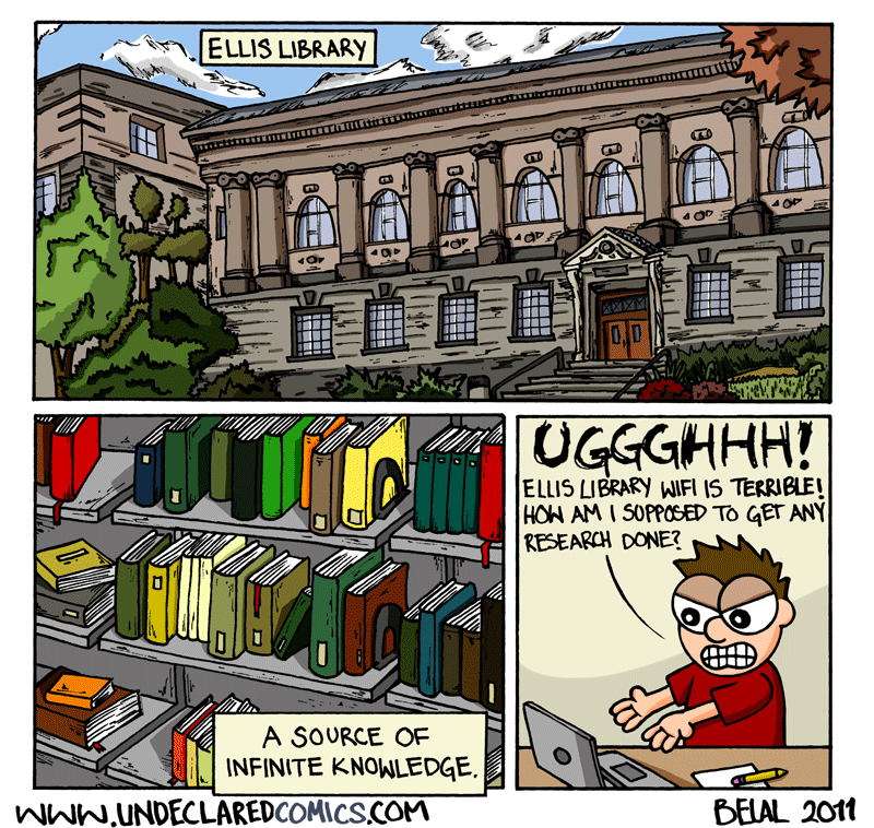 Dude, it's uncanny how much University of Missouri sounds like the college I go to, University of North Texas. Our library is fucking huge, but the internet over there sucks ass. Even the name of the library is similar; ours is called Willis.
