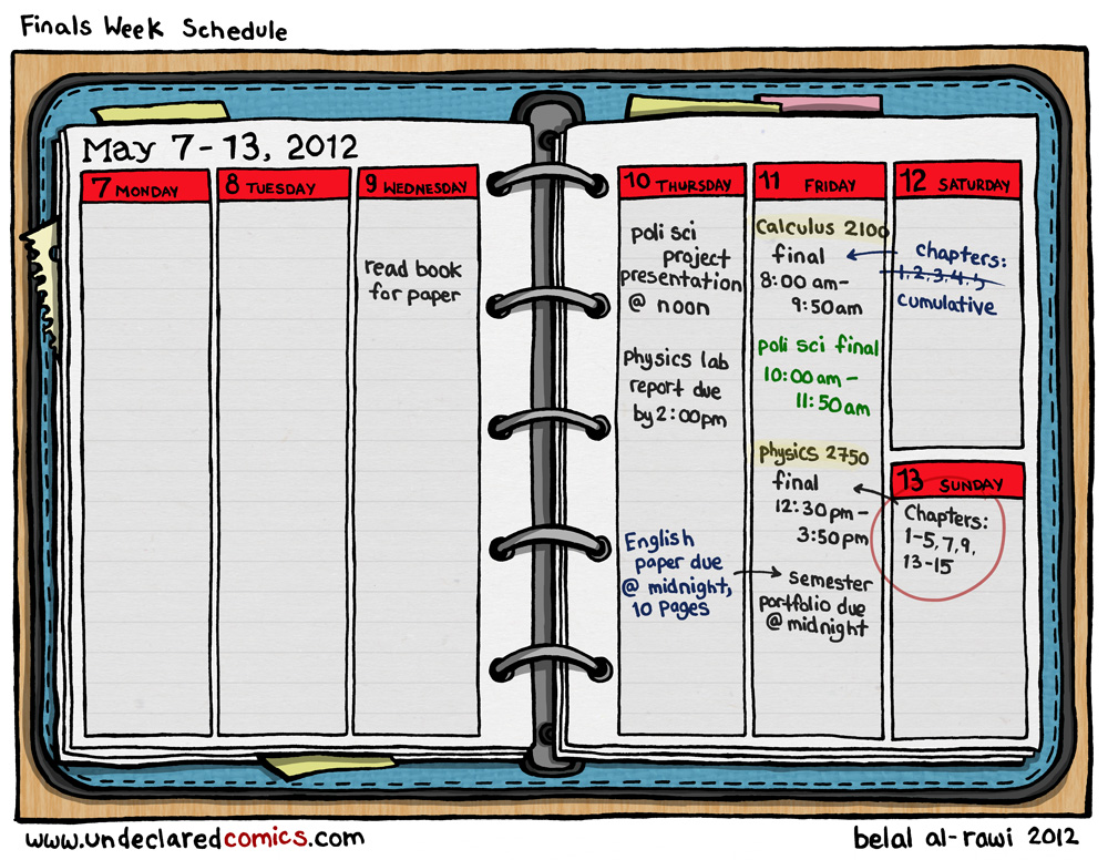 My final schedule May 9th: American Lit 10:00am-11:50am and May 10th: Environmental 8:00am-9:50am, Cell Biology 10:00am-11:50am, and Psychology 1:00pm-2:50pm. Oh did I mention all of them are comprehensive finals too!