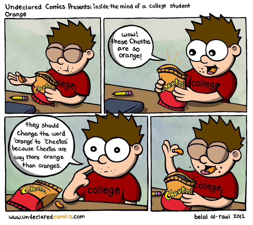 I love your drawing style, its so cute. Yet also normal in a way Also cheetos also has a little red put into it. So its more of a dark orange (makes no sense huh). Thats why they seem more orange than oranges.